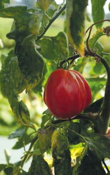 Stor päronformad tomat med ribbad frukt. God smak både färsk och tillagad.