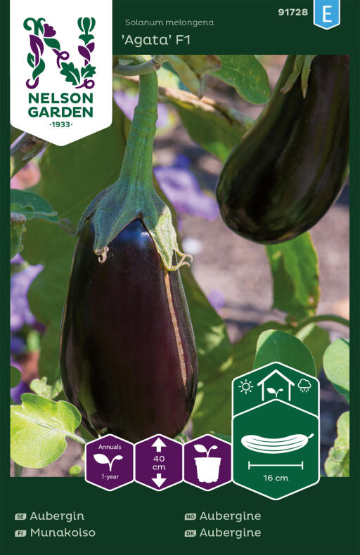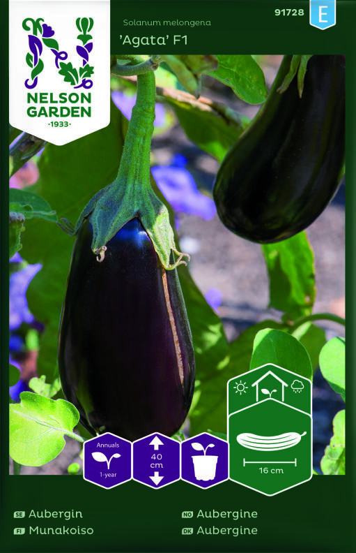 Bildar avlånga mörkt violetta frukter. Aubergin älskar värme, gärna 20-25 grader. Odla den i växthus eller utomhus i mycket skyddat läge. Skörda efterhand, drygt 5 månader efter sådd. Användbar i medelhavsmat som moussaka. Trivs i näringsrik och väldränerad jord. Vattna regelbundet.