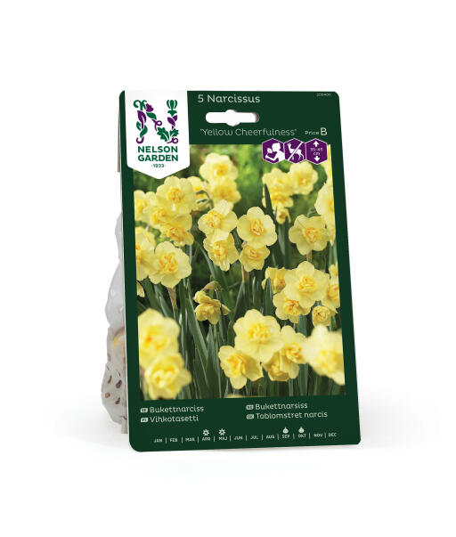 Detta är en bukettnarciss och som namnet antyder sitter två, ibland flera blommor på varje stängel. Blommorna är fyllda, ljusgula med lite gulorange och doftar ljuvligt. Anses vara mindre smaklig för rådjur, hare, kanin och sork.