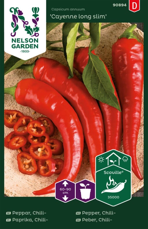 Värmeälskande chilipeppar, ca 35 000 Scoville. De avlånga gröna och röda frukterna används färska eller torkade. Tvätta alltid händerna när du hanterat färsk chili.