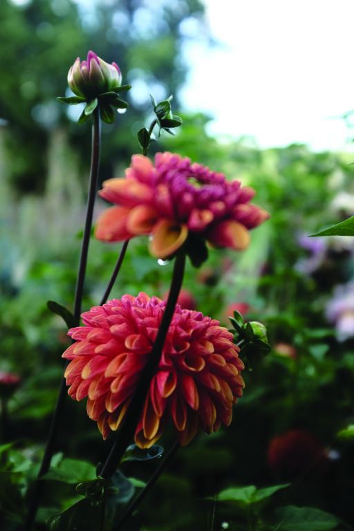 Hög aprikosfärgad pompomdahlia med mörka stjälkar som är underbar till snitt. En sommarens läckerhet i rabatt och bukett.