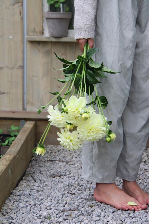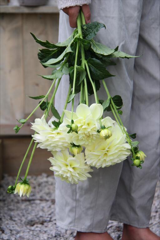 Mjukt cremefärgad småblommig dekorativdahlia som blommar generöst. Passar perfekt till snitt med sina höga stjälkar. Eller varför inte i en brudbukett?