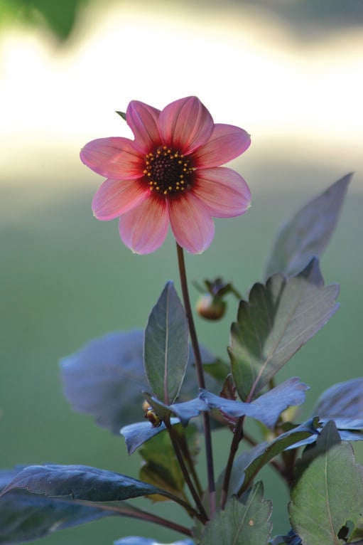 Trollbindande, nästintill hypnotisk enkelblommig dahlia med en mörk mitt och stora aprikosrosa kronblad. Blomman kan bli ca 9 cm och är vacker i såväl kruka som rabatt.