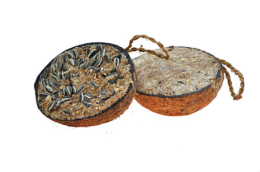 Urgröpt halv kokosnöt som fyllts med talg, spannmål och frön. Mycket energirik och därför omtyckt av vilda fåglar. Ca 330 g.