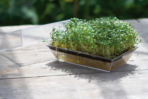 Odlingskit som innehåller groddtråg och fyra påsar krassefröer. Krasse är mycket lättodlat och har en mild smak av peppar. 10 x 15,5 cm