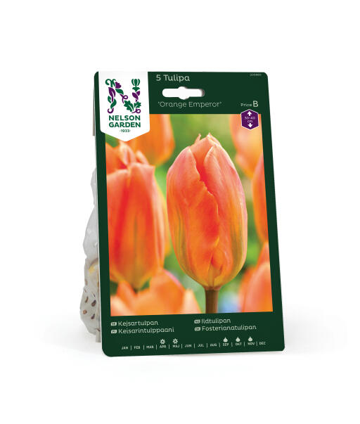 'Orange Emperor's stora avlånga blommor är lysande morotsorange med gul bas. Passar förutom i rabatten även bland buskar. Sorten tillhör Fosteriana-gruppen och kan bli långlivad i trädgården. Mycket bra som snittblommor.