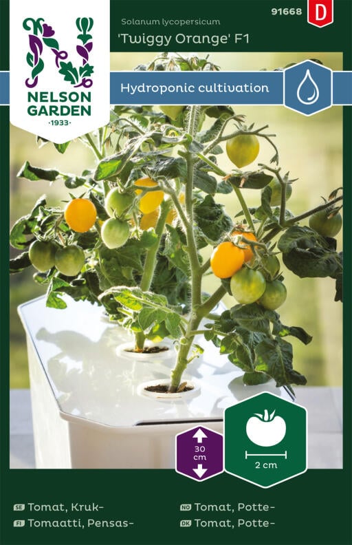 Kruktomat 'Twiggy Orange' F1 är en kul tomat att odla på köksbordet eller i kruka på balkong eller i trädgården. Härlig snackstomat för barn eftersom de enkelt kan plocka själva. Smaken gör den användbar till mycket.