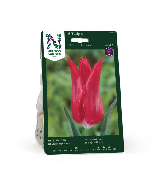 Denna blodröda tulpan blir nästan självlysande om den får lyfta sin vackra krona över vårblommor i ljusblå nyanser. Blommans eleganta form och de graciöst spetsiga kronbladen bidrar till det stolta uttrycket.