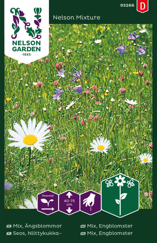 Mix, Ängsblommor Nelson Mixture är en fin blandning av klassiska, fleråriga, ängsblommor. I blandningen ingår till exempel klöver, prästkrage, blåklint, färgkulla och nysört som är vanliga att se i ängsmarker och väggrenar. Kring ängsblommor myllrar det alltid av liv. Ängsblommor bidrar till den biologiska mångfalden och är en viktig pollenkälla för många olika insekter. Att odla en plätt med ängsblommor någonstans i trädgården skapar fina förutsättningar för pollinatörerna att trivas och kan bidra till att även övriga växter i trädgården pollineras väl. Växterna har olika krav på växtplats vilket gör att det blir ett urval av arterna i blandningen som är mest lämpade för olika typer av växtplatser. Många ängsblommor vill växa i magra jordar så gödsling är inte nödvändigt. Ängsblommor har svårt att konkurrera med gräsmatta så fröna ska sås separat från gräsfrö. Ta bort grässvålen på den plats där fröna ska sås. Blommorna slås av under sensommaren, när de blommat över, för att fröerna ska kunna spridas på markytan. Växtmaterialet som slås av kan ligga kvar på platsen ett par dagar men tas sedan bort för att inte förmultna och tillföra näring till jorden. Fröna direktsås på odlingsplatsen under vår eller höst. För bättre kontakt med jorden bör fröerna tryckas lätt mot jordytan. Höstsådda ängsblommor blommar nästkommande år. Sådden täcks med fördel med fiberduk för att behålla fukten tills fröerna har grott. Ängsblommorna i denna blandning lämpar sig bäst för soliga till halvskuggiga lägen.