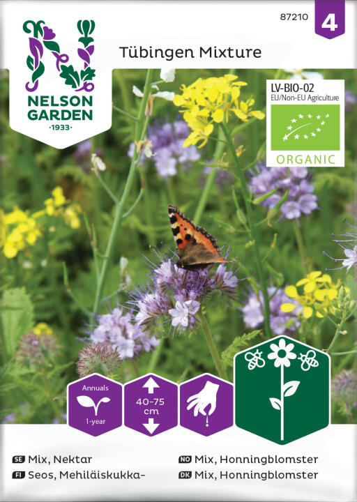 Mix Nektar 'Tübingen Mixture' innehåller olika ettåriga blommor som passar bra ihop och älskas av trädgårdens nyttodjur. Blandningen innehåller bland annat honungsfacelia, bovete, koriander, jungfrun i det gröna och blåklint. Dessa växter innehåller mycket nektar eller pollen vilket attraherar vildbin och andra pollinerande insekter. Mix nektar kan odlas i rabatter men även längs med kanten av ett fält eller väggren.