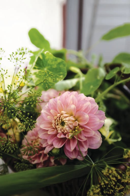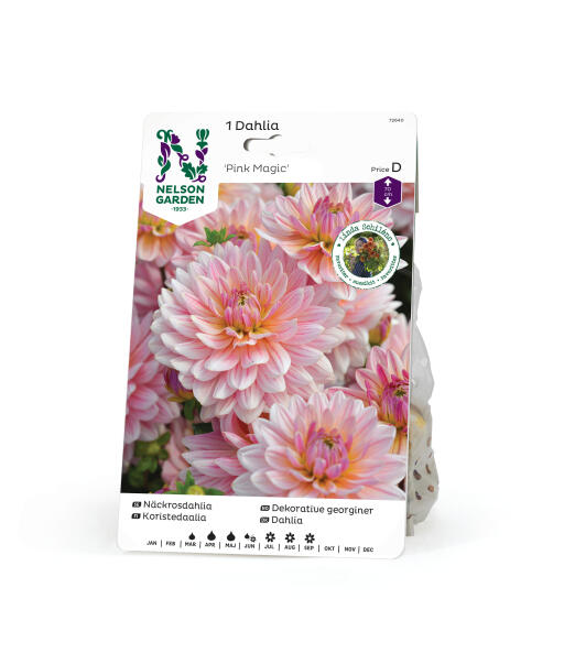 En näpen och lite lägre dekorativdahlia som blommar länge och på stadiga stjälkar. De mjukt rundade kronbladen har en ljuvt rosa grundton, gul bas och sirliga mörkrosa strimmor. Magisk i kruka, rabatt och vas.