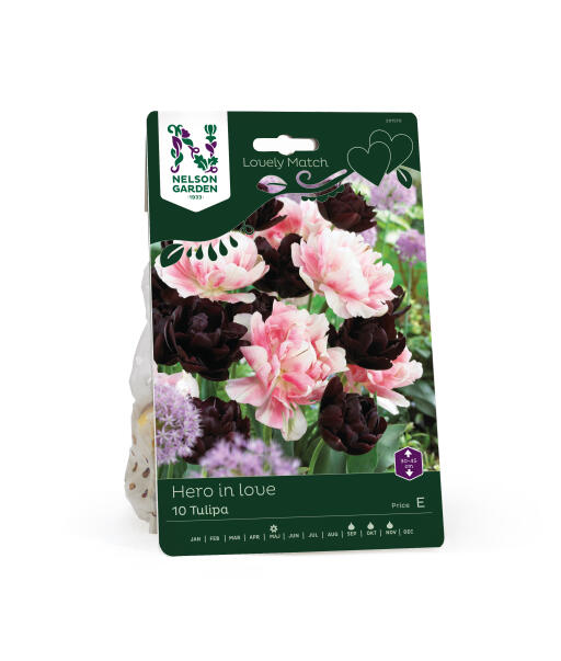 En romantisk blandning av härligt dubbla tulpaner. Den mörka och tuffa 'Black Hero' står likt en beskyddare bredvid den ljuvligt rosa 'Finola' - ett riktigt förtjusande par!