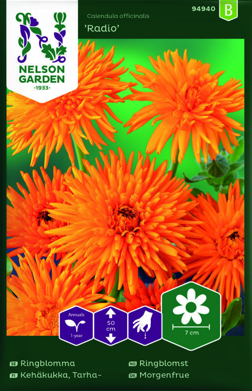 Härligt orange med citrusgul mitt, 'Radio' har odlats för sina fina blommor sedan 1930-talet. Traditionell köksträdgårdsväxt, de torkade bladen har använts för att färga och smaksätta grytor sedan romartiden. Läkande salvor tillverkas än idag från ringblommans torkade kronblad. Självsår sig. Blommorna visar sin mitt först när de är fullt mogna. Ringblomma är en lättodlad sommarblomma som man kan så och sedan glömma bort. Om allt annat misslyckas kan man alltid lyckas med ringblommor. Blommar från tidig sommar till höst. Lämpar sig väl för odling i kruka. Ringblomma trivs i väldränerad jord, tål torka och är en bra snittblomma. Den har inga särskilda krav på jordmån. När de första knopparna har bildats är det dags att börja gödsla regelbundet. Ta bort vissnade blommor kontinuerligt.