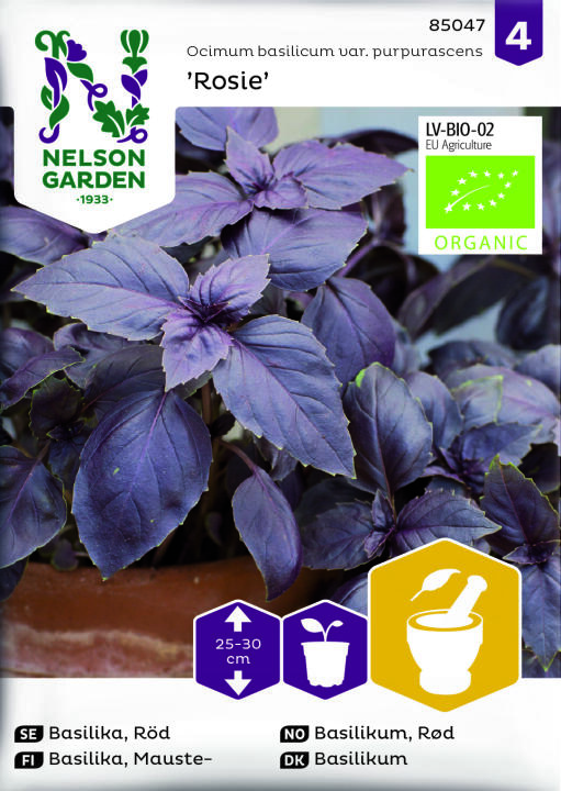 Ekologiskt frö. En dekorativ röd basilika som älskar värme. Odla gärna basilika i kruka på varm och solig plats. Bladen som skördas efter hand passar utmärkt till en smakrik röd pesto eller tillsammans med tomater och lite hyvlad parmesan.