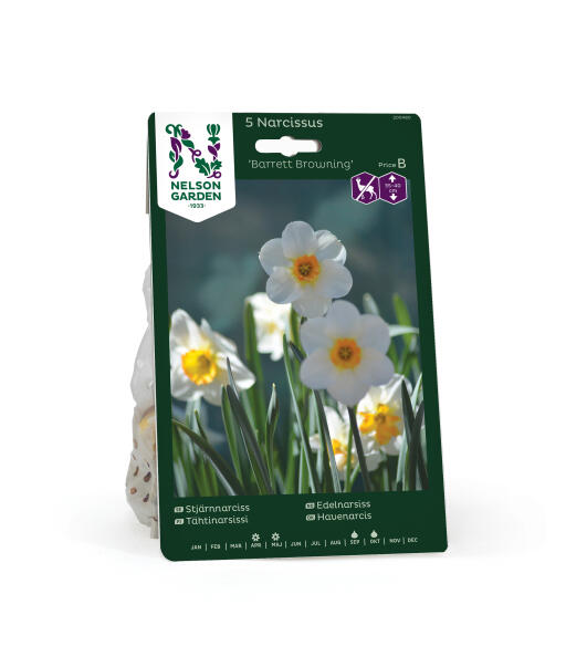 'Barrett Browning' är en stjärnnarciss som tillhör Småkroniga Gruppen. Denna sort har vita kalkblad och en bikrona, som är kraftigt orange. Anses vara mindre smaklig för rådjur, hare, kanin och sork.