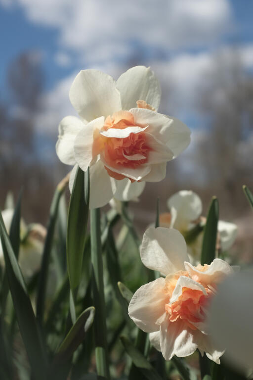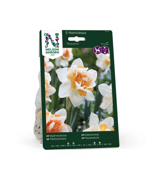 En elfenbensvit narciss till brädden fylld med en konstfullt veckad, dubbel trumpet i vitt, korallrosa och aprikos. Vacker som en dekorationsrosett i vårrabatten. Anses vara mindre smaklig för rådjur, hare, kanin och sork.