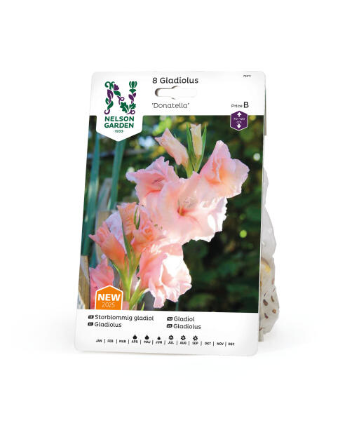 Ståtlig storblommig gladiol med mängder av aprikosfärgade blommor längs stjälken. Ger ett pampigt intryck i rabatt eller stor kruka.
