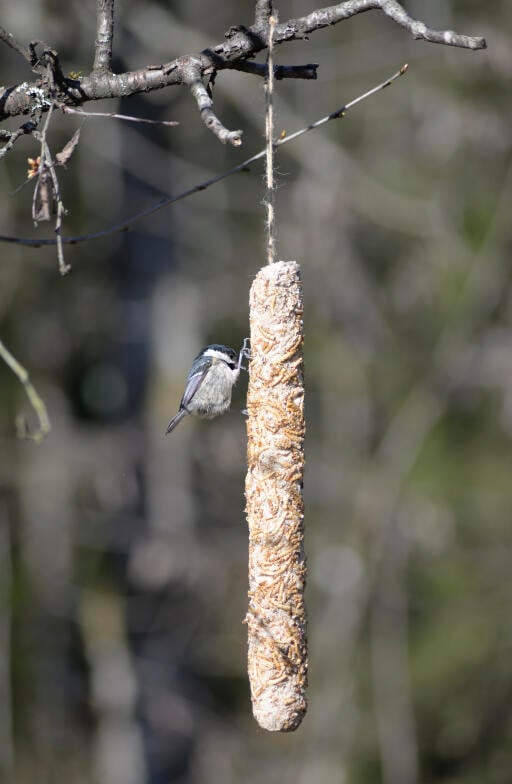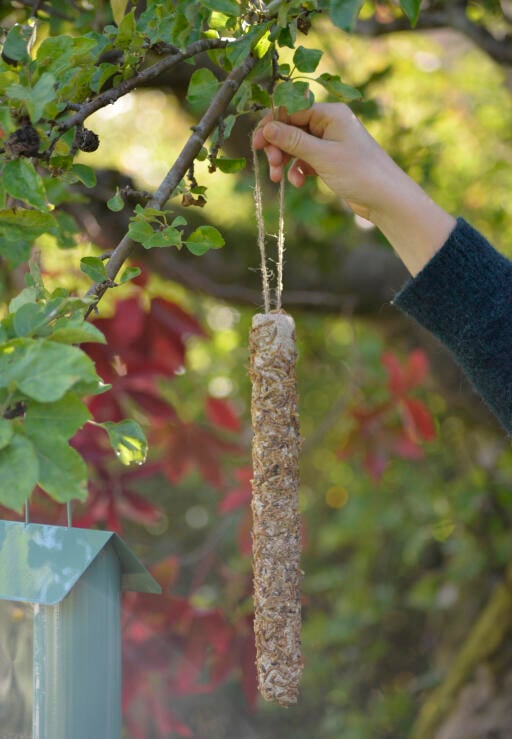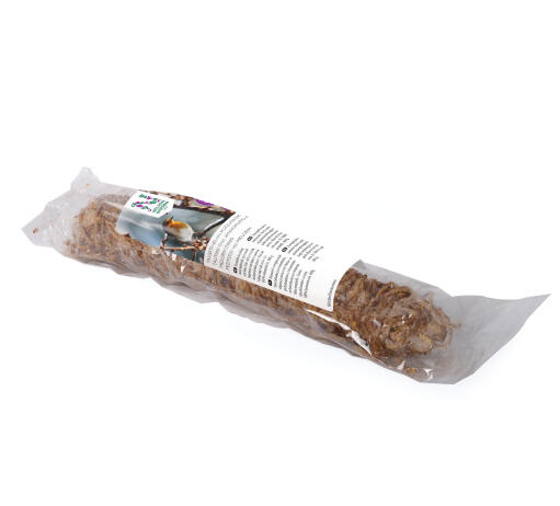 Energirik talgstång med mjölmask, spannmål och frön. Fett- och proteinrik fågelmat som bakats runt en komposterbar pinne. Klar att hänga upp i sitt snöre. En 100 % naturprodukt. 400 g