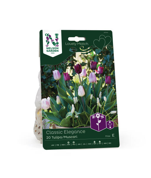 En välavvägd färgkombination från dovt vinrött, över lilarosa toner till vitaste vitt. Tulpanernas klassiska blomform framhävs fint av pärlhyacintens druvklasar av kritvita blommor. En stilren kombination för rabatt och kruka.