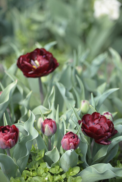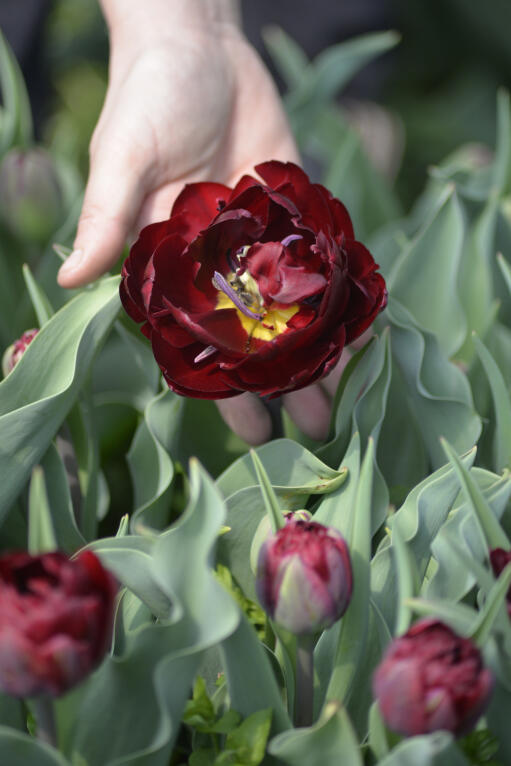 Ur en mycket mörk, nästan brun knopp slår denna djupt röda tulpan ut sitt överflöd av kronblad. Blomman liknar en pion eller en ros och är underbart vacker tillsammans med rosa eller vita tulpaner, vita narcisser eller blå pärlhyacinter.