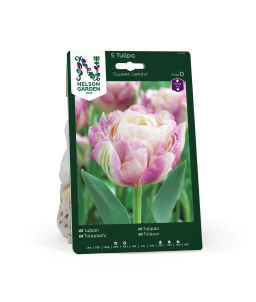 Söt som socker är denna tulpan med lager på lager av blomblad som skiftar från ljust lila och rosa till en gräddvit mitt. De yttre blombladen har dekorativa gröna strimmor. Underbart söt i kruka men passar även i rabatt och som snittblomma.