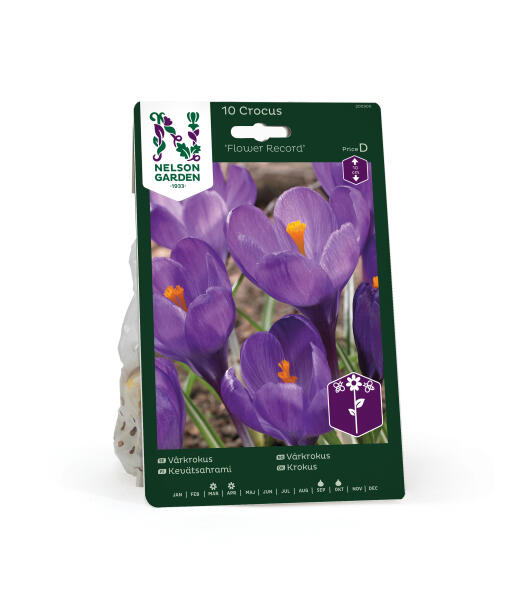 'Flower Record' är en vårkrokus med härligt stora blåvioletta blommor. Bland krokusarna har vårkrokusen de största blommorna. Passar fint förutom i rabatten, i kanten av buskar och framför träd där vårsolen lyser.