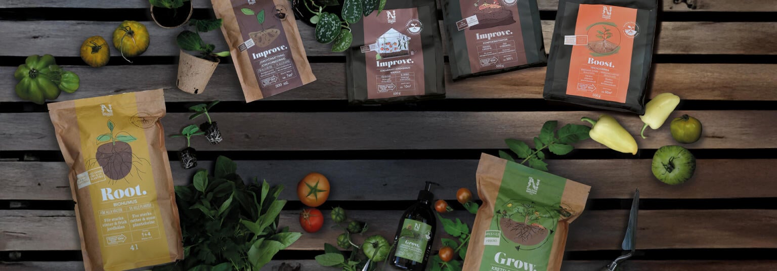 Produkter av naturbaserade råvaror, fyllda av nyttigheter som verkar för en friskare och mer levande jord- och planthälsa.