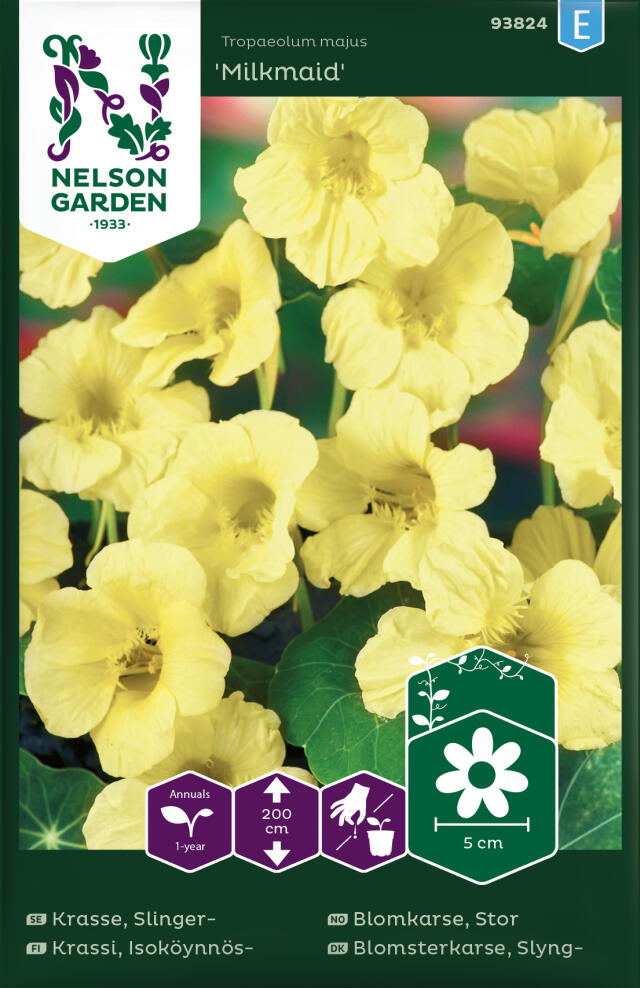 Frö till slingerkrasse finns även i flera härliga mixpåsar. ’Out of Africa’ blommar i gula, orange och röda nyanser och är särskilt praktfull med sitt grönvita bladverk. Glorious Gleam har fyllda blommor i starka färger och ett helgrönt bladverk.